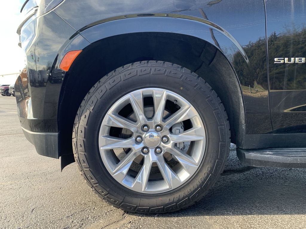 Preferred Equipment Group 1LZ: Bright Front and Rear Door Sill Plates; 20" X 9" Polished Aluminum Wheels; Memory Settings; Perforated Leather Seating Surfaces; 12-Way Power Driver and Passenger Seat Adjusters; Remote Start; 3rd Row 60/40 Power-Folding Split-Bench; Safety Alert Seat; Chrome Door Handles with Body-Color Strip; Hill Descent Control; Heated Steering Wheel; LED Daytime Running Lamps; Rear Cross Traffic Alert; Driver and Front Outboard Passenger Airbags; Heated Driver and Front Passenger Seats; Wireless Charging; Front Bucket Seats; Universal Home Remote; Color-Keyed Carpeting Floor Covering; Heated 2nd Row Outboard Seats; Hands-Free Rear Power Programmable Liftgate; Chevrolet Infotainment 3 Premium System Radio; 2-Speed Active Electronic Autotrac Transfer Case; 1st and 2nd Row Color-Keyed Carpeted Floor Mats; Enhanced Driver Information Center; Floor Console; Lane Change Alert with Side Blind Zone Alert; Chrome Mirror Caps; Dual Exhaust System; Sir